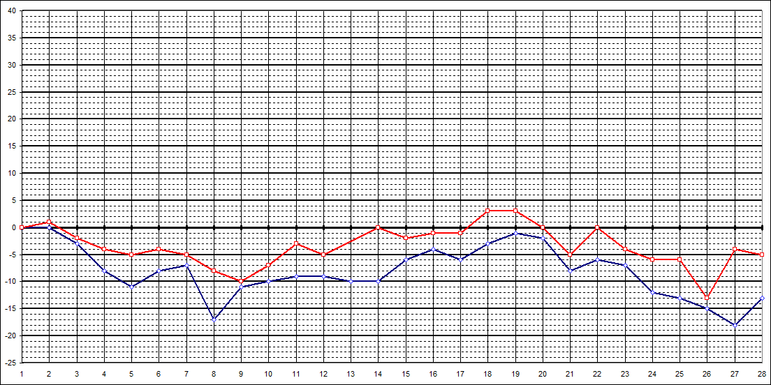 | 7 Uhr | 0 | 0 | -3 | -8 | -11 | -8 | -7 | -17 | -11 | -10 | -9 | -9 | -10 | -10 | -6 | -4 | -6 | -3 | -1 | -2 | -8 | -6 | -7 | -12 | -13 | -15 | -18 | -13 | |||||