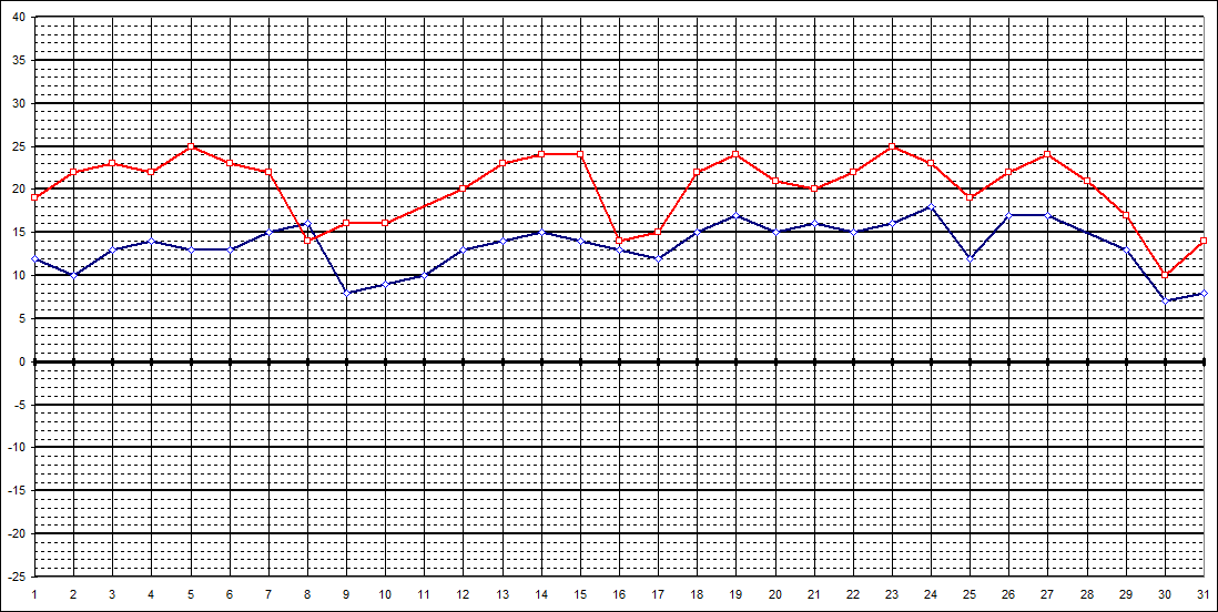 | 14 Uhr | 19 | 22 | 23 | 22 | 25 | 23 | 22 | 14 | 16 | 16 | 20 | 23 | 24 | 24 | 14 | 15 | 22 | 24 | 21 | 20 | 22 | 25 | 23 | 19 | 22 | 24 | 21 | 17 | 10 | 14 | |||