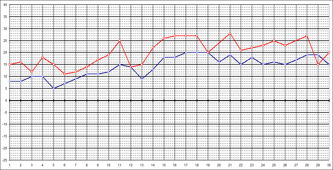 | 7 Uhr | 8 | 8 | 10 | 10 | 5 | 7 | 9 | 11 | 11 | 12 | 15 | 14 | 9 | 13 | 18 | 18 | 20 | 20 | 20 | 16 | 19 | 15 | 18 | 15 | 16 | 15 | 17 | 19 | 19 | 15 | |||