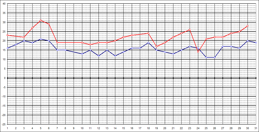 | 14 Uhr | 23 | 22 | 27 | 31 | 29 | 19 | 19 | 18 | 19 | 19 | 20 | 22 | 23 | 24 | 17 | 19 | 22 | 24 | 26 | 14 | 21 | 22 | 22 | 24 | 25 | 28 | |||||||