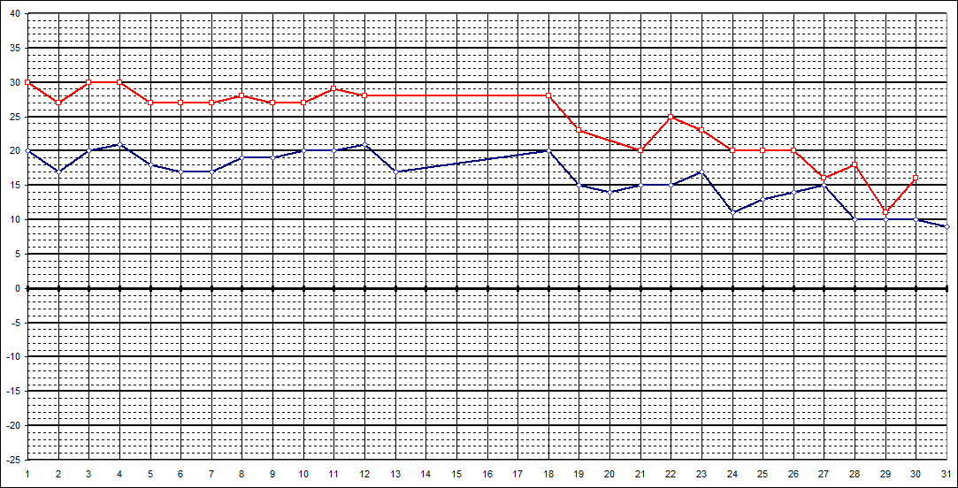 | 14 Uhr | 30 | 27 | 30 | 30 | 27 | 27 | 27 | 28 | 27 | 27 | 29 | 28 | 28 | 23 | 20 | 25 | 23 | 20 | 20 | 20 | 16 | 18 | 11 | 16 | |||||||||