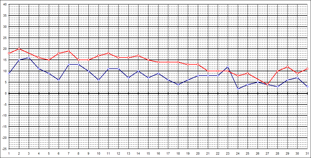 | 14 Uhr | 18 | 20 | 16 | 15 | 18 | 19 | 15 | 15 | 17 | 18 | 16 | 16 | 17 | 15 | 14 | 14 | 14 | 13 | 13 | 10 | 10 | 10 | 8 | 9 | 4 | 10 | 12 | 9 | 11 | ||||