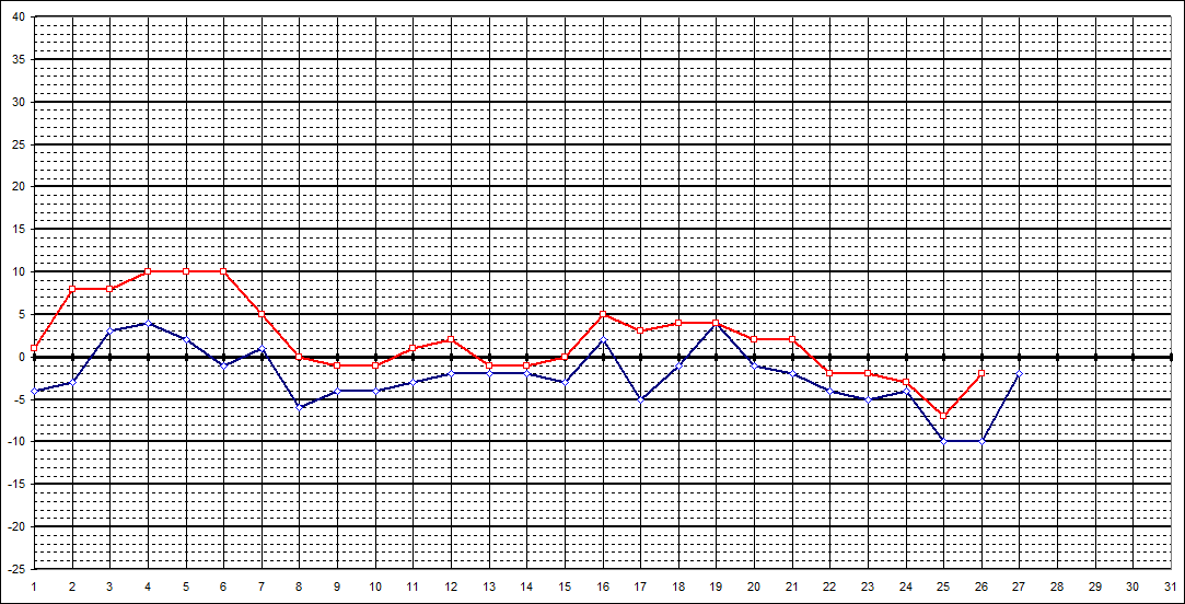 | 7 Uhr | -4 | -3 | 3 | 4 | 2 | -1 | 1 | -6 | -4 | -4 | -3 | -2 | -2 | -2 | -3 | 2 | -5 | -1 | 4 | -1 | -2 | -4 | -5 | -4 | -10 | -10 | -2 | ||||||