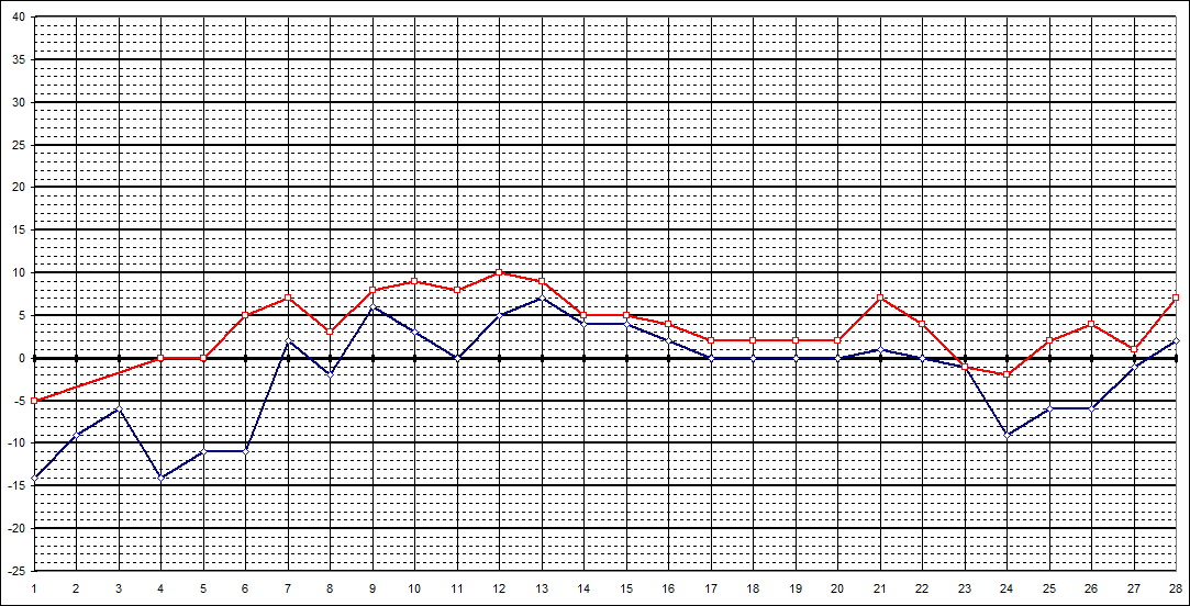 | 7 Uhr | -14 | -9 | -6 | -14 | -11 | -11 | 2 | -2 | 6 | 3 | 0 | 5 | 7 | 4 | 4 | 2 | 0 | 0 | 0 | 0 | 1 | 0 | -1 | -9 | -6 | -6 | -1 | 2 | |||||