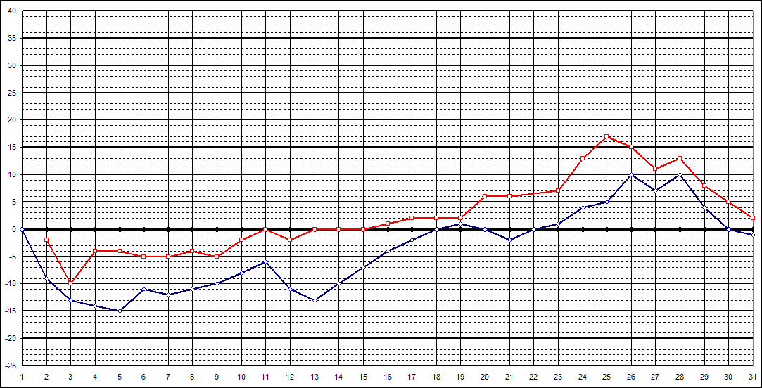 | 7 Uhr | 0 | -9 | -13 | -14 | -15 | -11 | -12 | -11 | -10 | -8 | -6 | -11 | -13 | -10 | -7 | -4 | -2 | 0 | 1 | 0 | -2 | 0 | 1 | 4 | 5 | 10 | 7 | 10 | 4 | 0 | -1 | ||