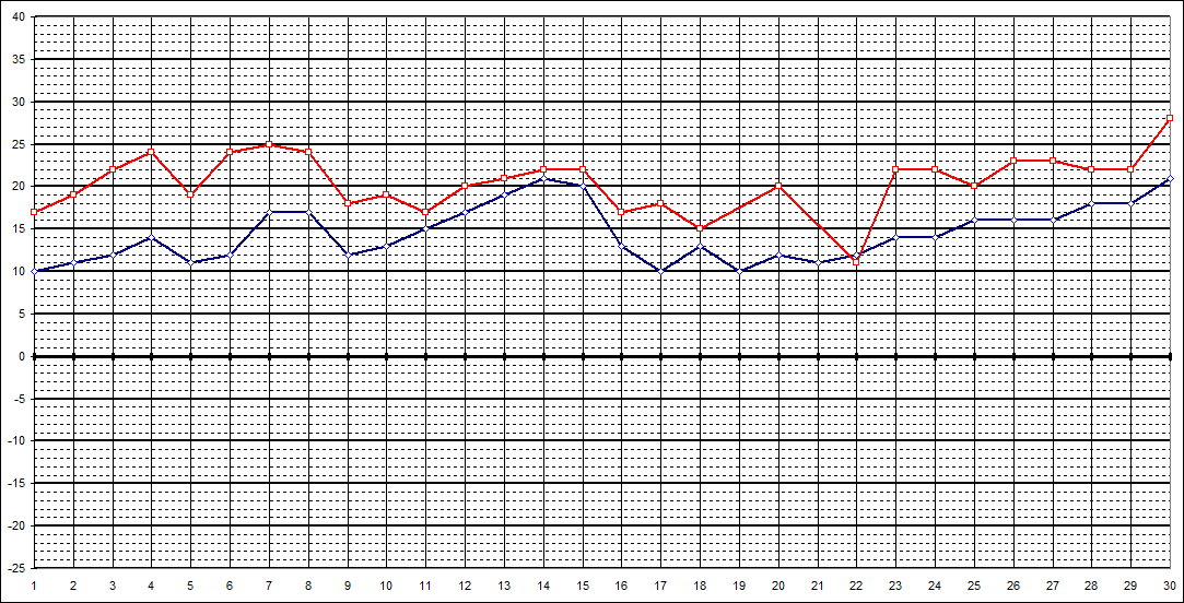 | 14 Uhr | 17 | 19 | 22 | 24 | 19 | 24 | 25 | 24 | 18 | 19 | 17 | 20 | 21 | 22 | 22 | 17 | 18 | 15 | 20 | 11 | 22 | 22 | 20 | 23 | 23 | 22 | 22 | 28 | |||||