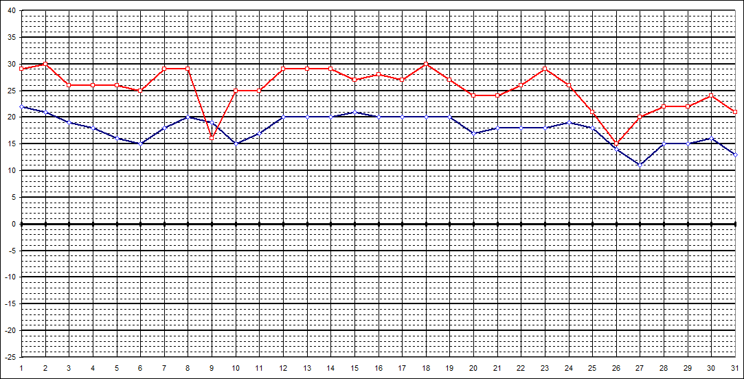 | 7 Uhr | 22 | 21 | 19 | 18 | 16 | 15 | 18 | 20 | 19 | 15 | 17 | 20 | 20 | 20 | 21 | 20 | 20 | 20 | 20 | 17 | 18 | 18 | 18 | 19 | 18 | 14 | 11 | 15 | 15 | 16 | 13 | ||
