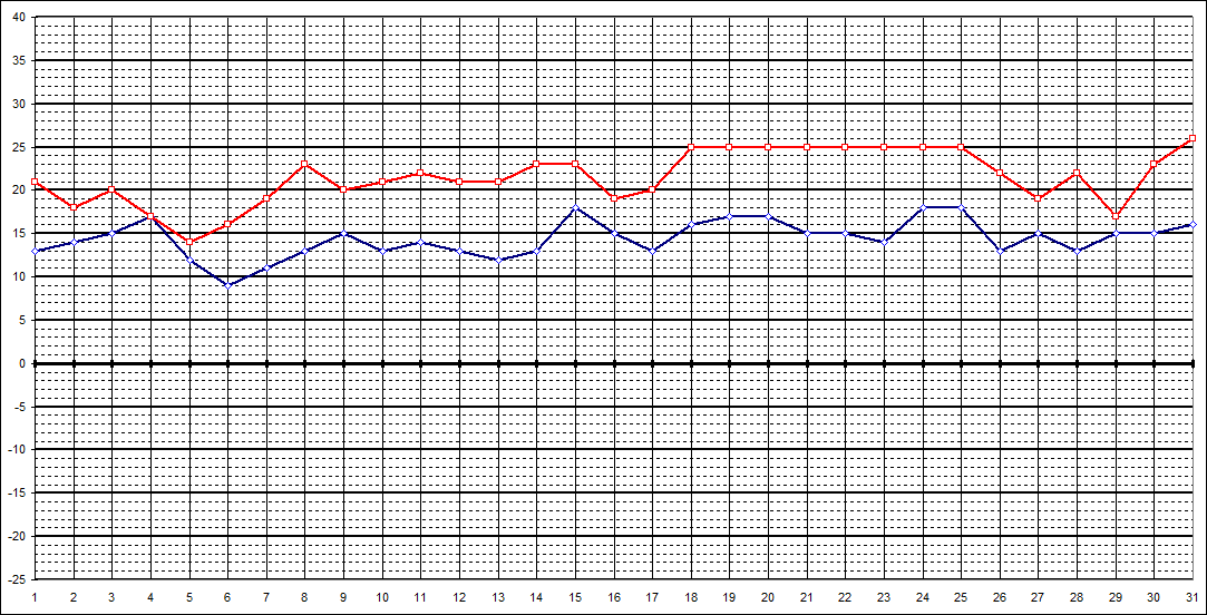 | 14 Uhr | 21 | 18 | 20 | 17 | 14 | 16 | 19 | 23 | 20 | 21 | 22 | 21 | 21 | 23 | 23 | 19 | 20 | 25 | 25 | 25 | 25 | 25 | 25 | 25 | 25 | 22 | 19 | 22 | 17 | 23 | 26 | ||