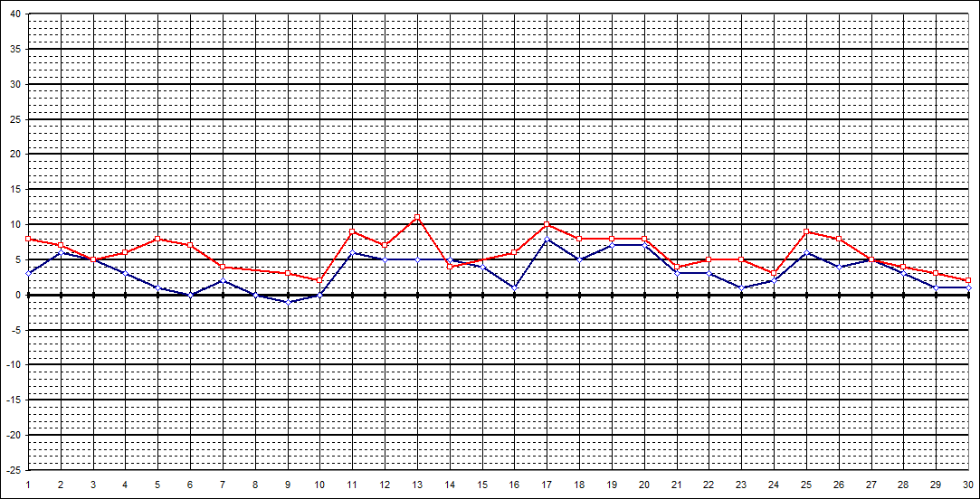 | 7 Uhr | 3 | 6 | 5 | 3 | 1 | 0 | 2 | 0 | -1 | 0 | 6 | 5 | 5 | 5 | 4 | 1 | 8 | 5 | 7 | 7 | 3 | 3 | 1 | 2 | 6 | 4 | 5 | 3 | 1 | 1 | |||