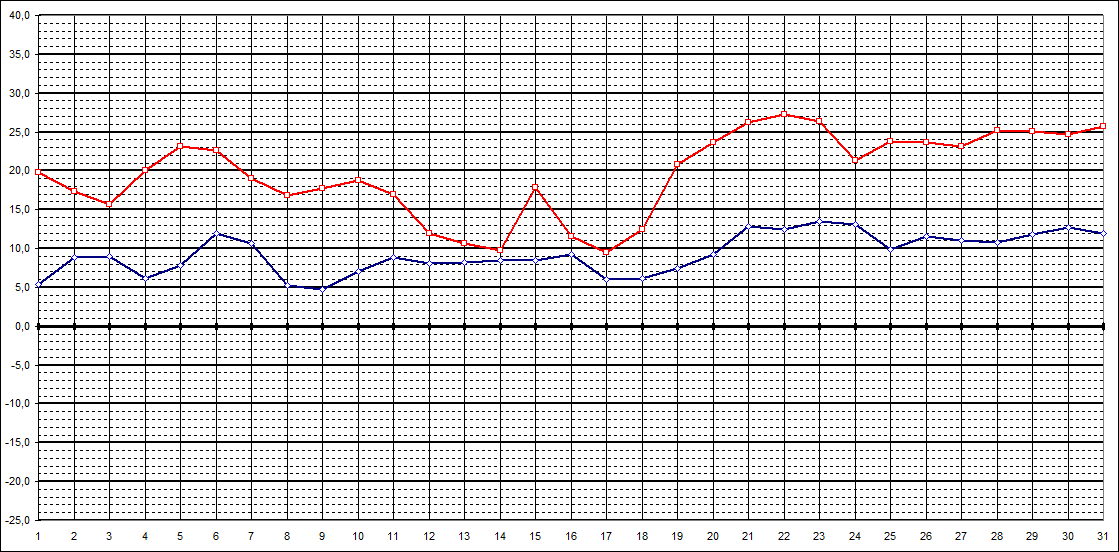 | Tageshöchstt. | 19,8 | 17,3 | 15,7 | 20,0 | 23,2 | 22,6 | 19,0 | 16,8 | 17,7 | 18,7 | 16,9 | 12,0 | 10,6 | 9,7 | 17,9 | 11,5 | 9,5 | 12,4 | 20,8 | 23,7 | 26,2 | 27,2 | 26,3 | 21,4 | 23,8 | 23,6 | 23,2 | 25,2 | 25,1 | 24,7 | 25,7 | ||||||||||||||||||||||||||||||||||||||||||||||||||||||||||||||||||||||||||||||||||||||||||||||||||||||||||||||||||||||||||||||||||||||||||||||||||||||||||||||||||||||||||||||||||||||||||||||||||||||||||||||||||||||||||||||||