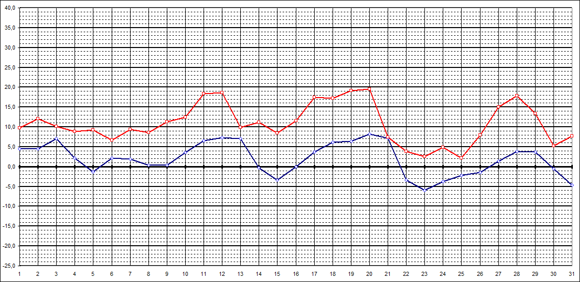 | Tageshöchstt. | 9,8 | 12,1 | 10,1 | 8,8 | 9,2 | 6,6 | 9,4 | 8,6 | 11,3 | 12,4 | 18,4 | 18,6 | 9,9 | 11,2 | 8,5 | 11,6 | 17,5 | 17,2 | 19,2 | 19,5 | 7,5 | 3,8 | 2,5 | 4,9 | 2,1 | 7,9 | 15,0 | 17,8 | 13,3 | 5,3 | 7,7 | ||||||||||||||||||||||||||||||||||||||||||||||||||||||||||||||||||||||||||||||||||||||||||||||||||||||||||||||||||||||||||||||||||||||||||||||||||||||||||||||||||||||||||||||||||||||||||||||||||||||||||||||||||||||||||||||||