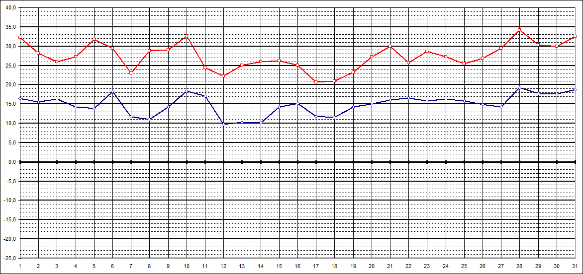 | Tageshöchstt. | 32,3 | 28,2 | 26,0 | 27,3 | 31,7 | 29,4 | 23,0 | 28,8 | 29,0 | 32,7 | 24,4 | 22,3 | 25,1 | 26,0 | 26,2 | 25,1 | 20,7 | 21,0 | 23,3 | 27,3 | 30,0 | 25,7 | 28,7 | 27,3 | 25,5 | 26,9 | 29,4 | 34,2 | 30,3 | 30,0 | 32,5 | ||||||||||||||||||||||||||||||||||||||||||||||||||||||||||||||||||||||||||||||||||||||||||||||||||||||||||||||||||||||||||||||||||||||||||||||||||||||||||||||||||||||||||||||||||||||||||||||||||||||||||||||||||||||||||||||||