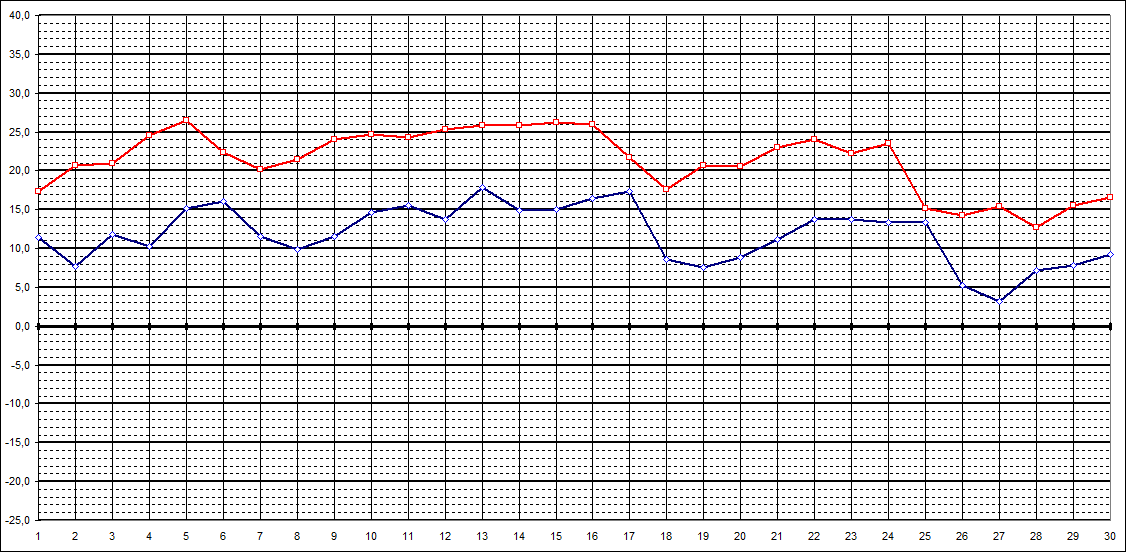 | Tageshöchstt. | 17,4 | 20,7 | 20,9 | 24,5 | 26,5 | 22,4 | 20,2 | 21,5 | 24,0 | 24,7 | 24,3 | 25,3 | 25,9 | 25,8 | 26,2 | 26,0 | 21,7 | 17,6 | 20,7 | 20,6 | 23,0 | 24,0 | 22,3 | 23,5 | 15,2 | 14,3 | 15,4 | 12,7 | 15,5 | 16,6 | |||||||||||||||||||||||||||||||||||||||||||||||||||||||||||||||||||||||||||||||||||||||||||||||||||||||||||||||||||||||||||||||||||||||||||||||||||||||||||||||||||||||||||||||||||||||||||||||||||||||||||||||||||||||||||||||||