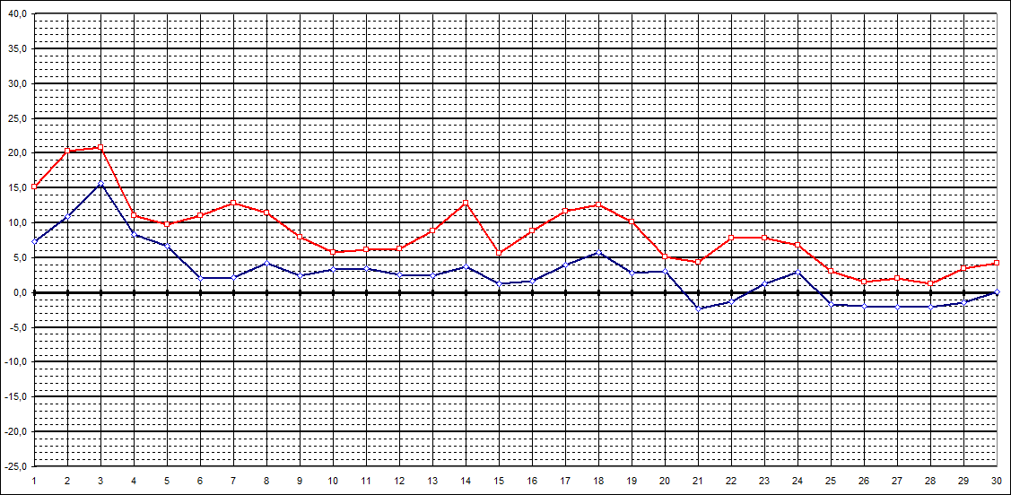 | Tageshöchstt. | 15,1 | 20,3 | 20,8 | 11,1 | 9,8 | 11,0 | 12,9 | 11,4 | 7,9 | 5,8 | 6,1 | 6,3 | 8,8 | 12,9 | 5,6 | 8,8 | 11,7 | 12,6 | 10,2 | 5,1 | 4,4 | 7,8 | 7,8 | 6,8 | 3,0 | 1,5 | 2,0 | 1,2 | 3,5 | 4,2 | |||||||||||||||||||||||||||||||||||||||||||||||||||||||||||||||||||||||||||||||||||||||||||||||||||||||||||||||||||||||||||||||||||||||||||||||||||||||||||||||||||||||||||||||||||||||||||||||||||||||||||||||||||||||||||||||||