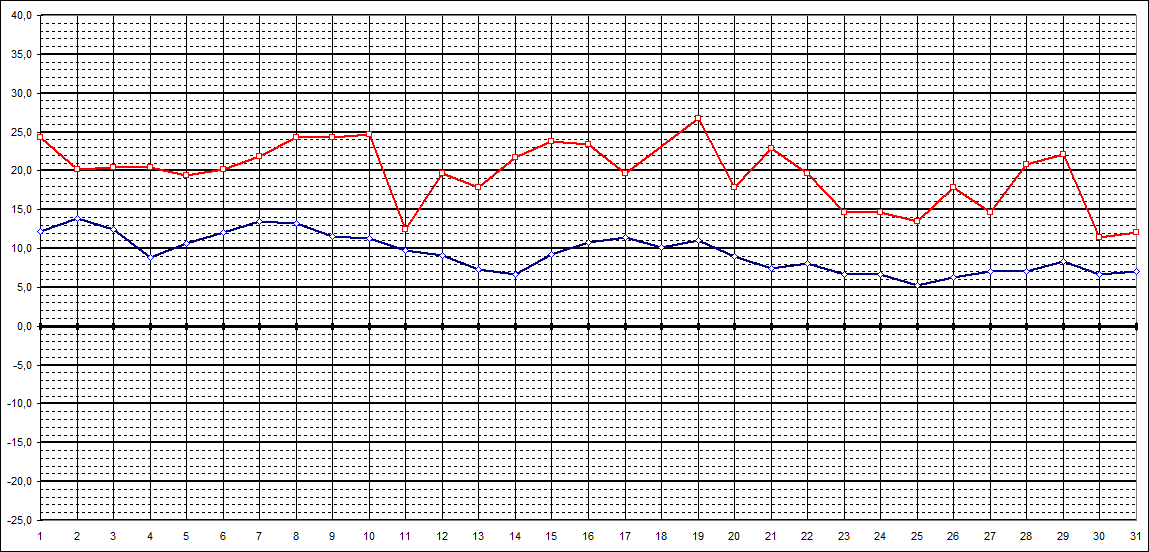 | Tageshöchstt. | 24,3 | 20,2 | 20,5 | 20,5 | 19,4 | 20,2 | 21,9 | 24,3 | 24,3 | 24,7 | 12,4 | 19,7 | 17,9 | 21,7 | 23,8 | 23,4 | 19,7 | 26,7 | 17,9 | 22,9 | 19,7 | 14,7 | 14,7 | 13,5 | 17,9 | 14,7 | 20,8 | 22,1 | 11,4 | 12,1 | |||||||||||||||||||||||||||||||||||||||||||||||||||||||||||||||||||||||||||||||||||||||||||||||||||||||||||||||||||||||||||||||||||||||||||||||||||||||||||||||||||||||||||||||||||||||||||||||||||||||||||||||||||||||||||||||||