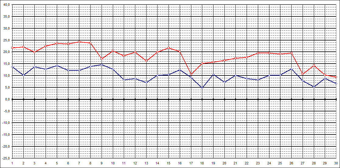 | Tageshöchstt. | 21,7 | 22,1 | 19,9 | 22,5 | 23,6 | 23,4 | 24,3 | 23,8 | 17,1 | 20,4 | 18,4 | 19,9 | 16,2 | 19,9 | 21,7 | 20,2 | 10,5 | 15,1 | 15,7 | 16,4 | 17,4 | 17,7 | 19,5 | 19,5 | 19,1 | 19,5 | 10,7 | 14,2 | 10,3 | 9,4 | |||||||||||||||||||||||||||||||||||||||||||||||||||||||||||||||||||||||||||||||||||||||||||||||||||||||||||||||||||||||||||||||||||||||||||||||||||||||||||||||||||||||||||||||||||||||||||||||||||||||||||||||||||||||||||||||||