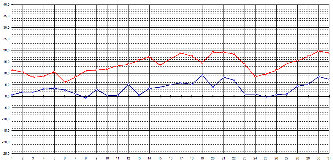| Tageshöchstt. | 11,6 | 10,5 | 8,2 | 8,8 | 10,6 | 6,1 | 8,3 | 11,2 | 11,4 | 12,0 | 13,3 | 13,9 | 15,7 | 17,2 | 13,5 | 16,5 | 18,9 | 17,5 | 14,7 | 19,2 | 19,2 | 18,5 | 13,9 | 8,6 | 9,7 | 11,3 | 14,3 | 15,5 | 17,4 | 19,7 | 19,0 | ||||||||||||||||||||||||||||||||||||||||||||||||||||||||||||||||||||||||||||||||||||||||||||||||||||||||||||||||||||||||||||||||||||||||||||||||||||||||||||||||||||||||||||||||||||||||||||||||||||||||||||||||||||||||||||||||