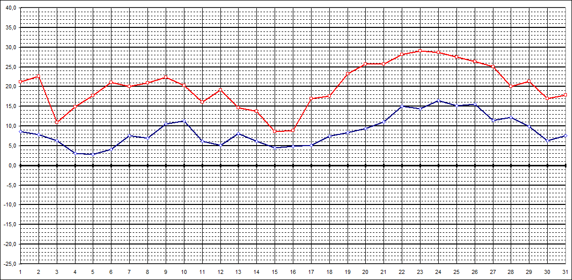 | Tageshöchstt. | 21,2 | 22,6 | 10,9 | 14,9 | 17,7 | 21,1 | 20,0 | 20,9 | 22,4 | 20,3 | 16,1 | 19,1 | 14,6 | 13,7 | 8,6 | 8,9 | 16,9 | 17,6 | 23,3 | 25,7 | 25,7 | 28,2 | 29,1 | 28,7 | 27,5 | 26,4 | 25,1 | 20,0 | 21,4 | 16,9 | 17,9 | ||||||||||||||||||||||||||||||||||||||||||||||||||||||||||||||||||||||||||||||||||||||||||||||||||||||||||||||||||||||||||||||||||||||||||||||||||||||||||||||||||||||||||||||||||||||||||||||||||||||||||||||||||||||||||||||||