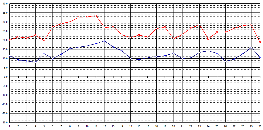 | Tageshöchstt. | 20,0 | 21,9 | 21,2 | 22,8 | 19,8 | 27,1 | 29,0 | 30,1 | 32,5 | 32,8 | 33,4 | 26,9 | 27,4 | 23,0 | 21,5 | 22,8 | 21,9 | 26,4 | 27,1 | 20,8 | 23,2 | 26,6 | 28,6 | 20,7 | 24,4 | 24,4 | 26,5 | 28,0 | 28,4 | 18,9 | |||||||||||||||||||||||||||||||||||||||||||||||||||||||||||||||||||||||||||||||||||||||||||||||||||||||||||||||||||||||||||||||||||||||||||||||||||||||||||||||||||||||||||||||||||||||||||||||||||||||||||||||||||||||||||||||||