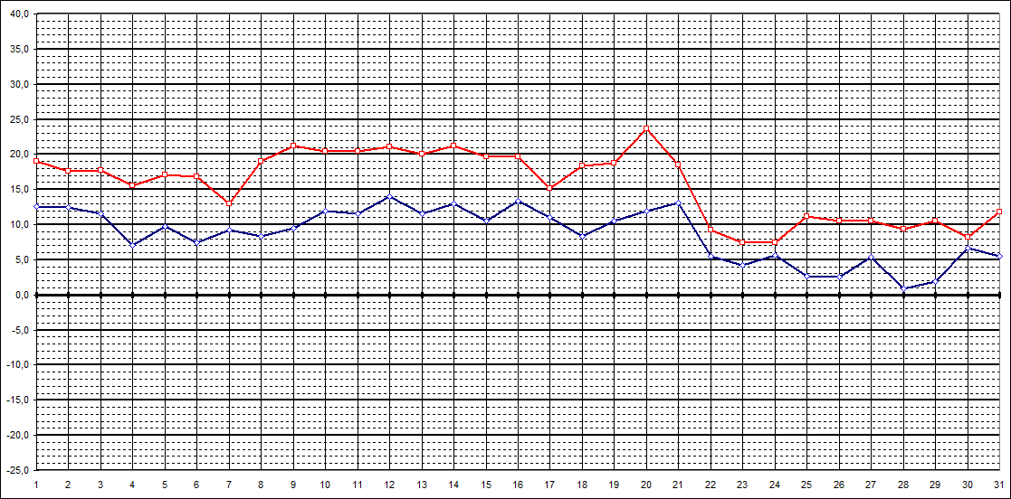 | Tageshöchstt. | 19,0 | 17,6 | 17,7 | 15,5 | 17,1 | 16,8 | 13,0 | 19,0 | 21,2 | 20,4 | 20,4 | 21,1 | 20,0 | 21,2 | 19,7 | 19,6 | 15,1 | 18,4 | 18,7 | 23,6 | 18,5 | 9,3 | 7,5 | 7,4 | 11,2 | 10,5 | 10,5 | 9,4 | 10,5 | 8,2 | 11,8 | ||||||||||||||||||||||||||||||||||||||||||||||||||||||||||||||||||||||||||||||||||||||||||||||||||||||||||||||||||||||||||||||||||||||||||||||||||||||||||||||||||||||||||||||||||||||||||||||||||||||||||||||||||||||||||||||||