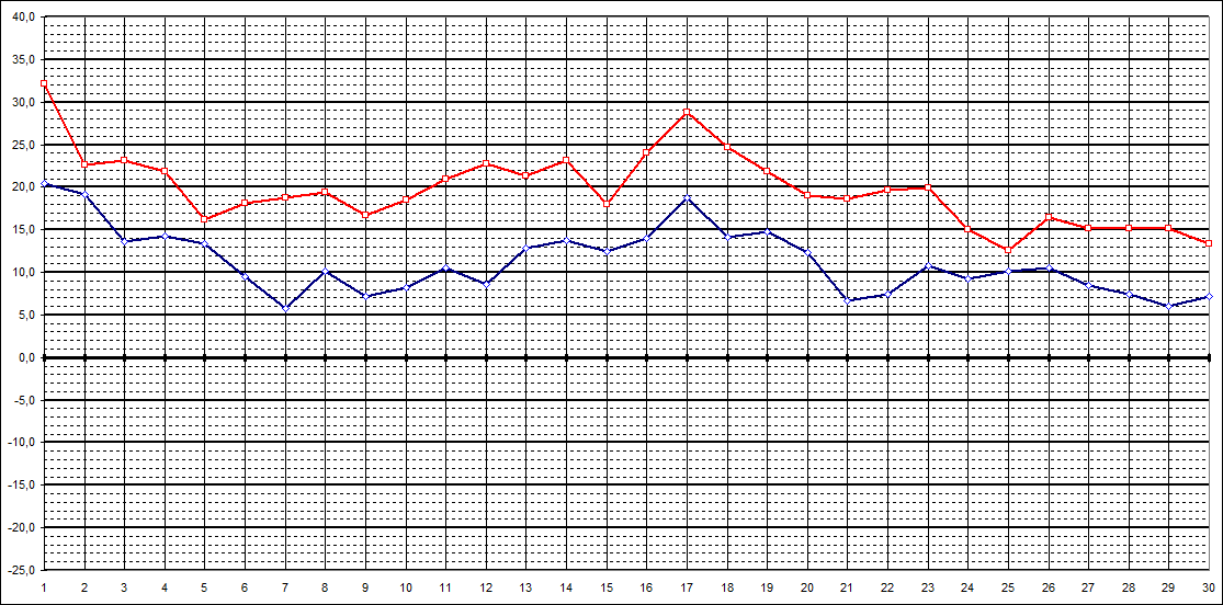 | Tagestiefstt. | 20,5 | 19,1 | 13,6 | 14,2 | 13,4 | 9,5 | 5,8 | 10,2 | 7,2 | 8,2 | 10,5 | 8,6 | 12,8 | 13,7 | 12,4 | 14,0 | 18,8 | 14,1 | 14,8 | 12,3 | 6,6 | 7,4 | 10,8 | 9,2 | 10,1 | 10,5 | 8,5 | 7,5 | 6,0 | 7,2 | |||||||||||||||||||||||||||||||||||||||||||||||||||||||||||||||||||||||||||||||||||||||||||||||||||||||||||||||||||||||||||||||||||||||||||||||||||||||||||||||||||||||||||||||||||||||||||||||||||||||||||||||||||||||||||||||||